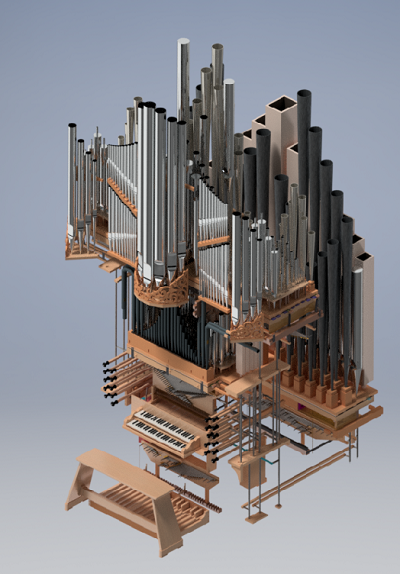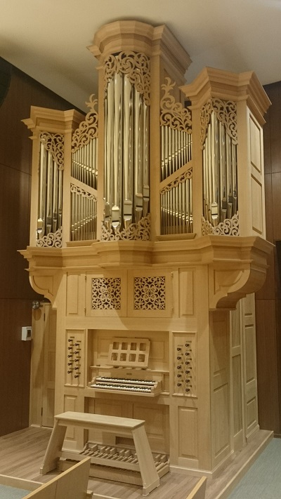 とある学校の礼拝堂に新設した2段鍵盤ペダル付のオルガンです。ペダルに16' Posauneを備え、大曲もしっかり支えます。Schnitgerのデザインを継承しているヒストリッシュなオルガンです。このオルガンの設計には3D CADを用いて、設計時に部品の干渉など実際に作ってみないと判らない問題を設計時点で把握し、結果作業効率の向上を目指しました。また、客先へ説得力のあるのプレゼンテーションも行うことができました。