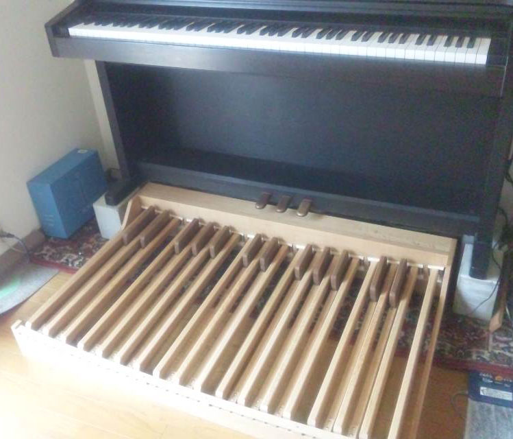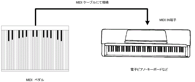 MIDI ペダルからの「MIDI OUT」信号を、お手持ちの電子ピアノ・キーボードなどの「MIDI IN」端子に接続することによって、ペダル鍵盤で電子ピアノから音を発生させることが出来ます。