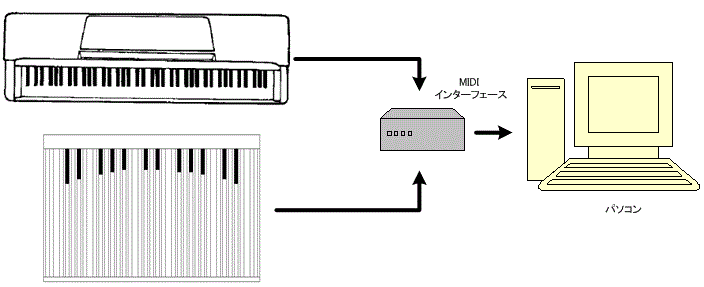電子楽器とMIDIペダルからの「MIDI OUT」信号を MIDIインターフェースを経由してパソコンに入力します。