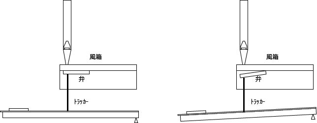 実際のパイプオルガンの鍵盤は、その構造上、押し下げると直ちに発音いたします。これは、鍵盤から風箱内部の空気弁までのトラッカーメカニックの遊びが極力排除してあるからです。また、「つり鍵盤」という構造上からも遊びが無くなるような構造となっております。